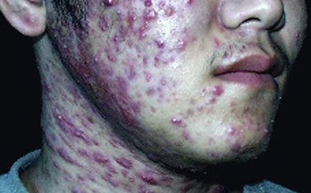 首先,痤疮是主要的损害,少量丘疹和脓疱。该病的面积为二十。在这之后,会有粉刺,中等数量的丘疹和脓疱,且总病灶数是31和50之间。大量的丘疹和脓疱会在未来发生的,和大量的炎性病变分布广泛。病灶总数在51~100之间。在发育末期,有结节状、囊性或聚合性痤疮。大多数病人患有疼痛和囊肿。病变数目非常大。有3多个结节和囊肿。